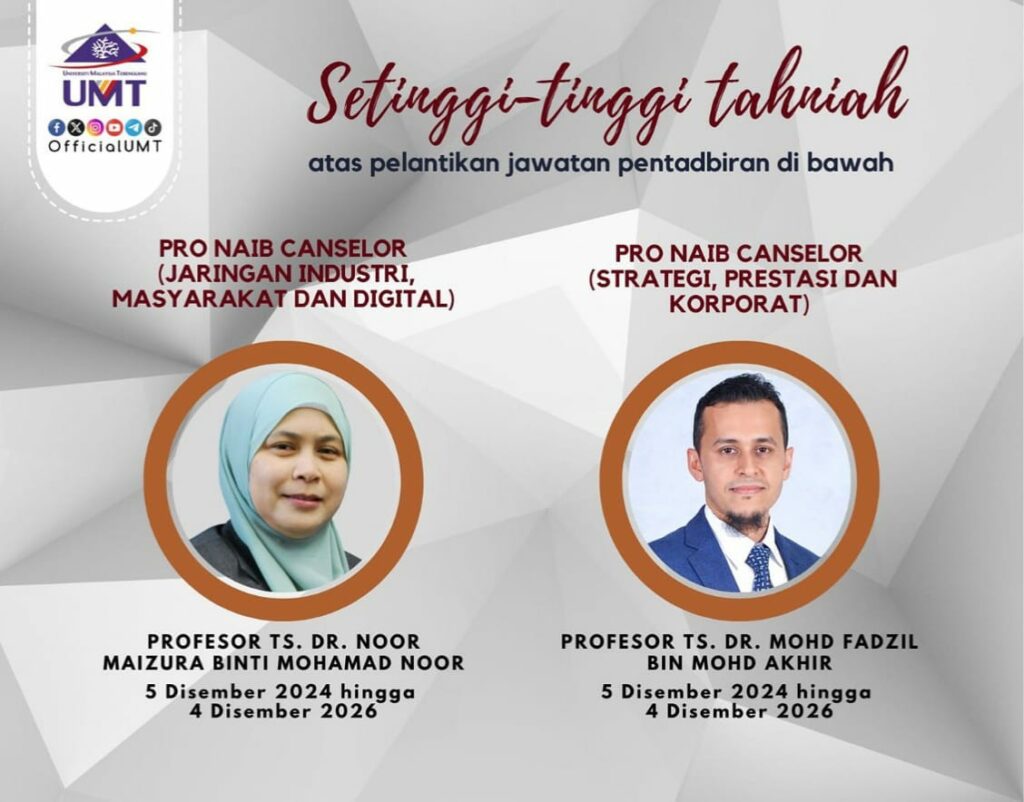 Pelantikan pengurusan baharu bakal meneruskan agenda pemerkasaan UMT Ahad, 26/01/2025 Share This Article : Kuala Nerus, 19 Januari 2025 – Universiti Malaysia Terengganu (UMT) menerima pelantikan baharu Timbalan Naib Canselor (Akademik dan Antarabangsa) Prof. Dr. Suriyani Muhamad berkuatkuasa pada 19 Januari 2025. Memiliki latar belakang akademik dalam bidang ekonomi dan merupakan Dekan Fakulti Perniagaan, Ekonomi […]