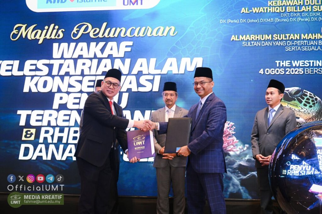 Majlis penuh bersejarah itu turut menyaksikan pemeteraian Perjanjian Persefahaman (MoA) antara Universiti Malaysia Terengganu (UMT) dan RHB Islamic Bank Berhad (RHB Islamic), sebagai simbolik kerjasama strategik ke arah pelaksanaan inisiatif wakaf berimpak tinggi bagi kelestarian biodiversiti marin.