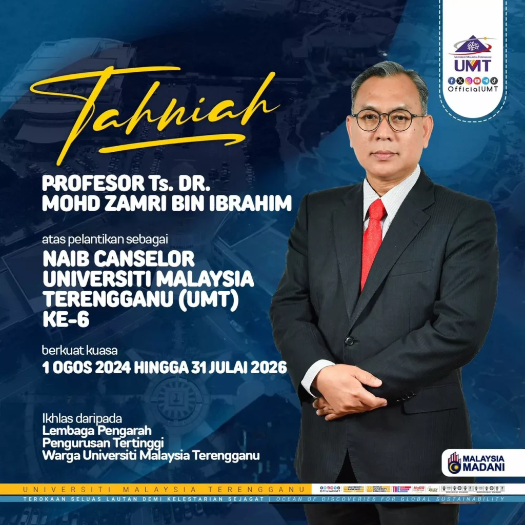 Prof. Ts. Dr. Mohd Zamri Appointed Sixth Vice Chancellor of UMT Thursday, 25/7/2024 Share This Article : Deputy Vice Chancellor (Academic and International) of Universiti Malaysia Terengganu (UMT) Prof. Ts. Dr. Mohd Zamri Ibrahim has been appointed as the sixth Vice Chancellor of the university for a period of two years effective 1 August 2024 […]