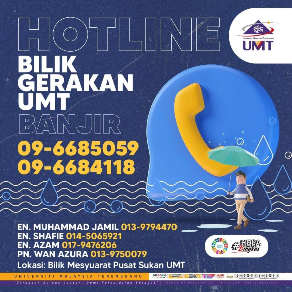 Kuala Nerus – Universiti Malaysia Terengganu (UMT) telah mengaktifkan Bilik Gerakan Bencana bagi memberi maklumat terkini dan bantuan kepada para pelajar dan kakitangan yang berada di dalam kampus dan sekitarnya.