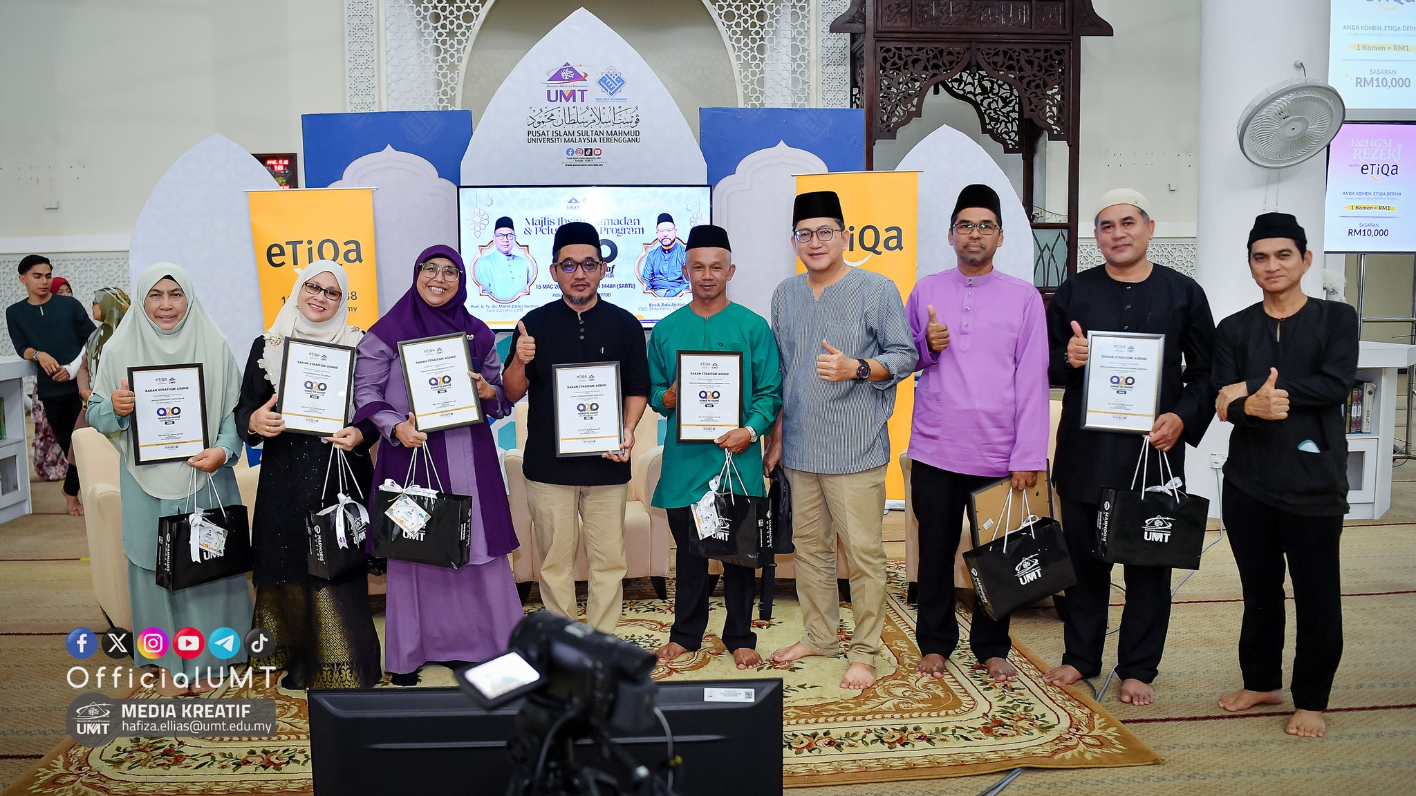 During the event also attended by selected asnaf members of the UMT community, Etiqa Family Takaful Berhad contributed RM10,000.00 in zakat funds to UMT to support asnaf students, RM10,000.00 in duit raya (festive allowances) for 200 asnaf students, and RM5,000.00 to provide free iftar meals for 200 asnaf students.