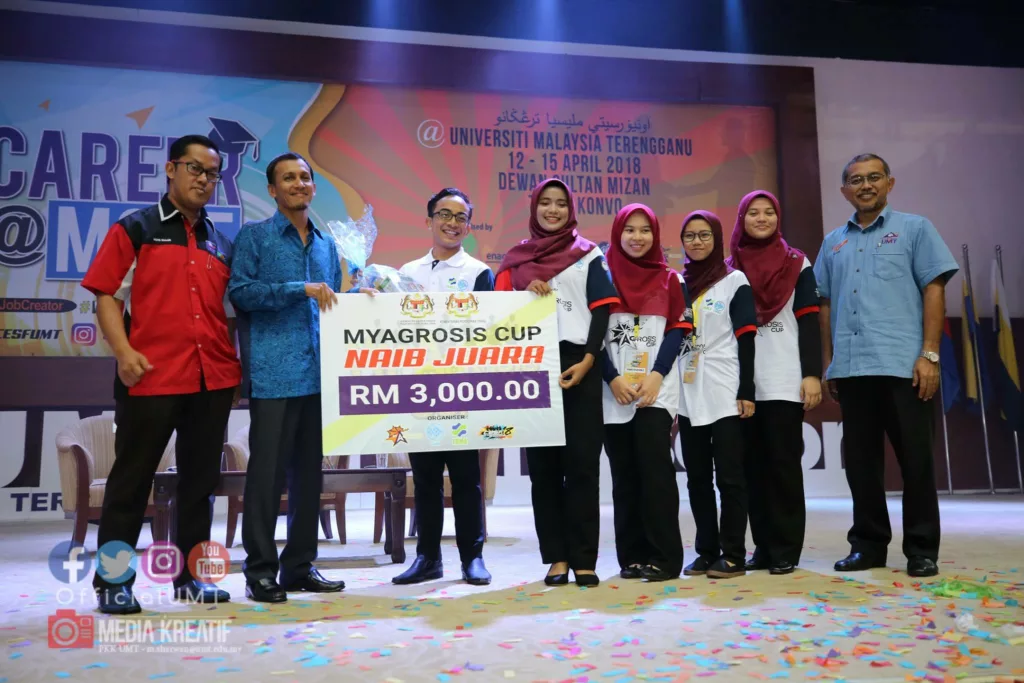 KUALA NERUS – Universiti Malaysia Terengganu (UMT) dinobatkan sebagai Naib Johan bagi pertandingan MYAGROSIS CUP 2018 sempena penganjuran Career Entrepreneurship and Skills Festival 2018 (CESF’18) yang diadakan selama empat hari bermula 12 April 2018 lalu di Dataran Pesta Konvokesyen UMT.