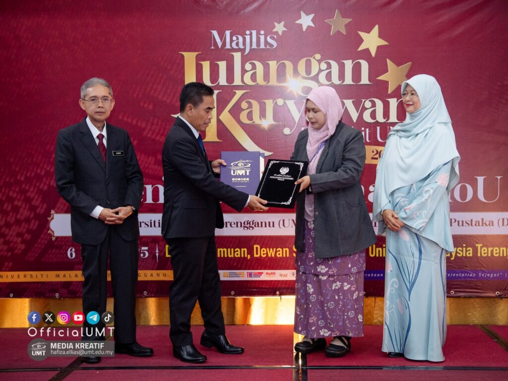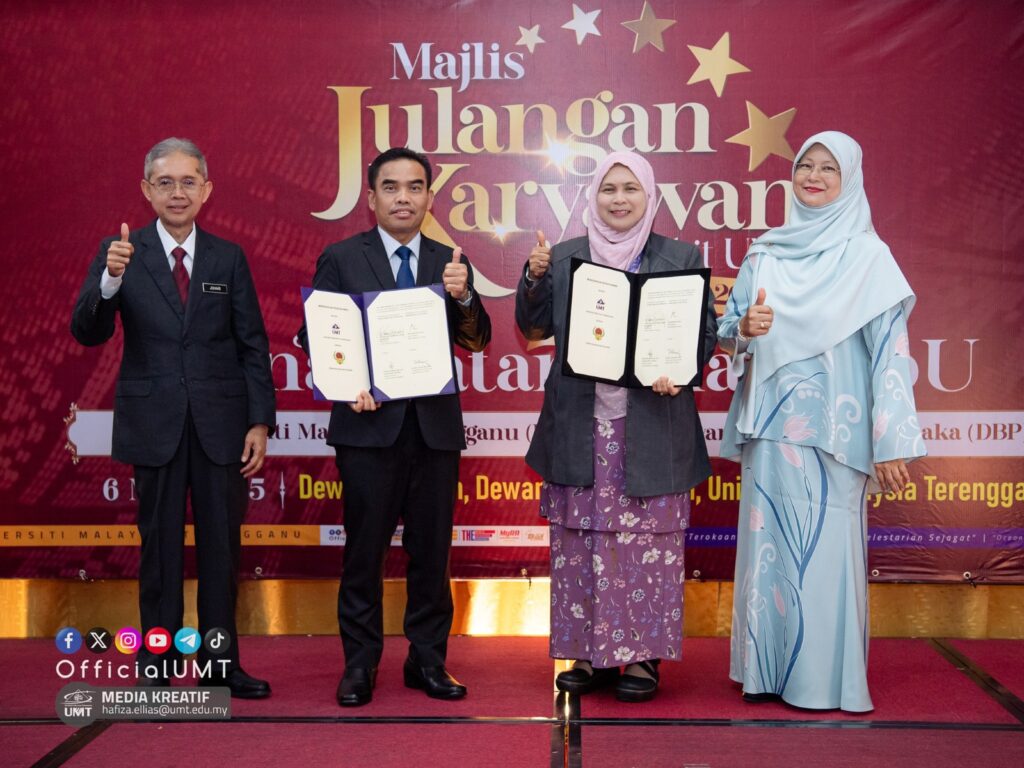 Kuala Nerus, 6 Mei 2025 – Universiti Malaysia Terengganu (UMT) terus melakar kecemerlangan dalam dunia penerbitan apabila memeterai Memorandum Persefahaman (MoU) bersama Dewan Bahasa dan Pustaka (DBP) sempena Majlis Julangan Karyawan yang berlangsung di kampus universiti hari ini.