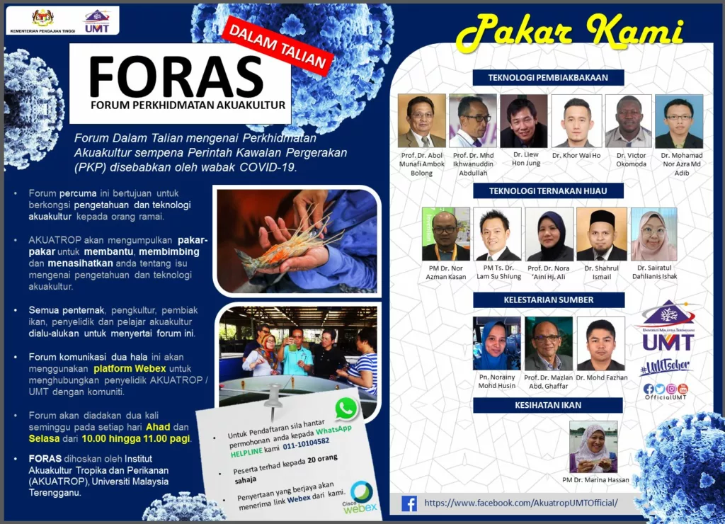Ketua Institut Akuakultur Tropika dan Perikanan (Akuatrop) UMT, Prof Madya Dr Marina Hasan berkata, ‘Forum on Aquaculture Services’ (FORAS) itu adalah inisiatif UMT berkaitan perkhidmatan akuakultur, termasuk menyediakan khidmat nasihat dan bantuan kepakaran menggunakan aplikasi Webex.