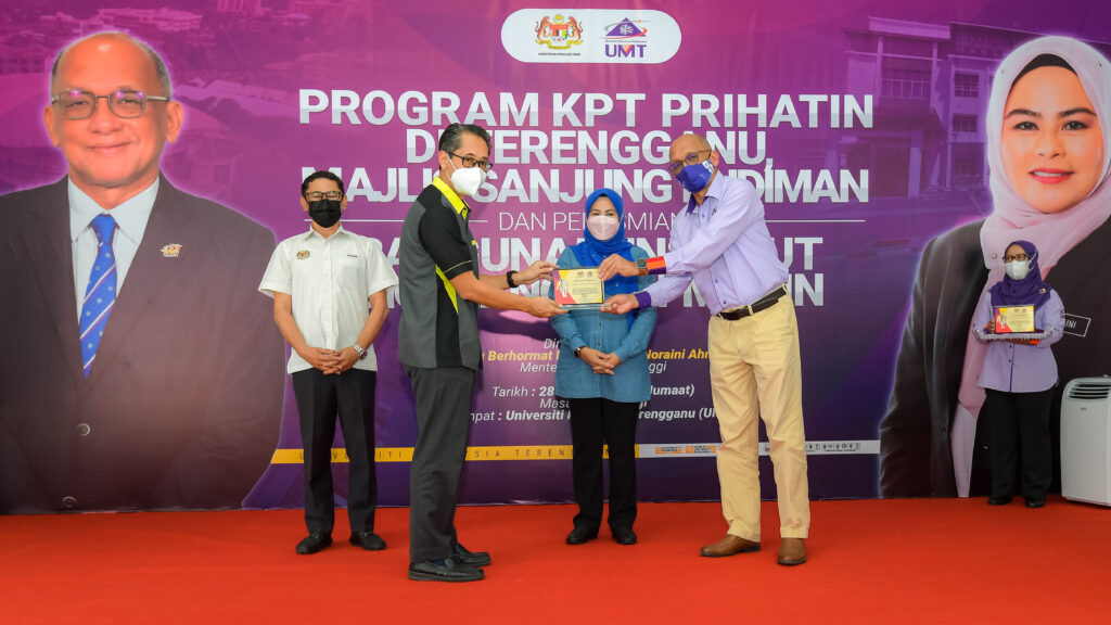 Sumbangan ini diserahkan oleh wakil-wakil badan korporat kepada Yang Berhormat Datuk Seri Dr. Noraini Ahmad, Menteri Pengajian Tinggi bagi pihak UMT sempena Program KPT Prihatin di Terengganu, Majlis Sanjung Budiman dan Perasmian Bangunan Institut Bioteknologi Marin yang berlangsung pada 28 Januari di UMT.